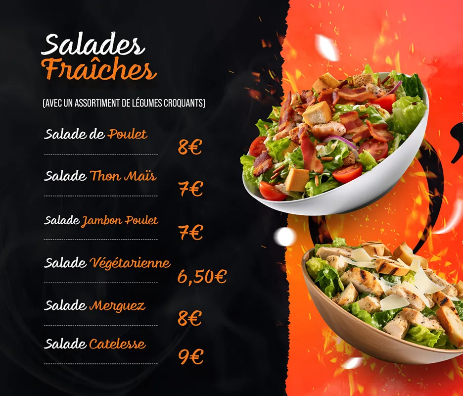 Envie de fraîcheur et de légèreté sans faire l’impasse sur la gourmandise ? Découvrez nos salades généreuses, préparées avec des ingrédients frais et savoureux.